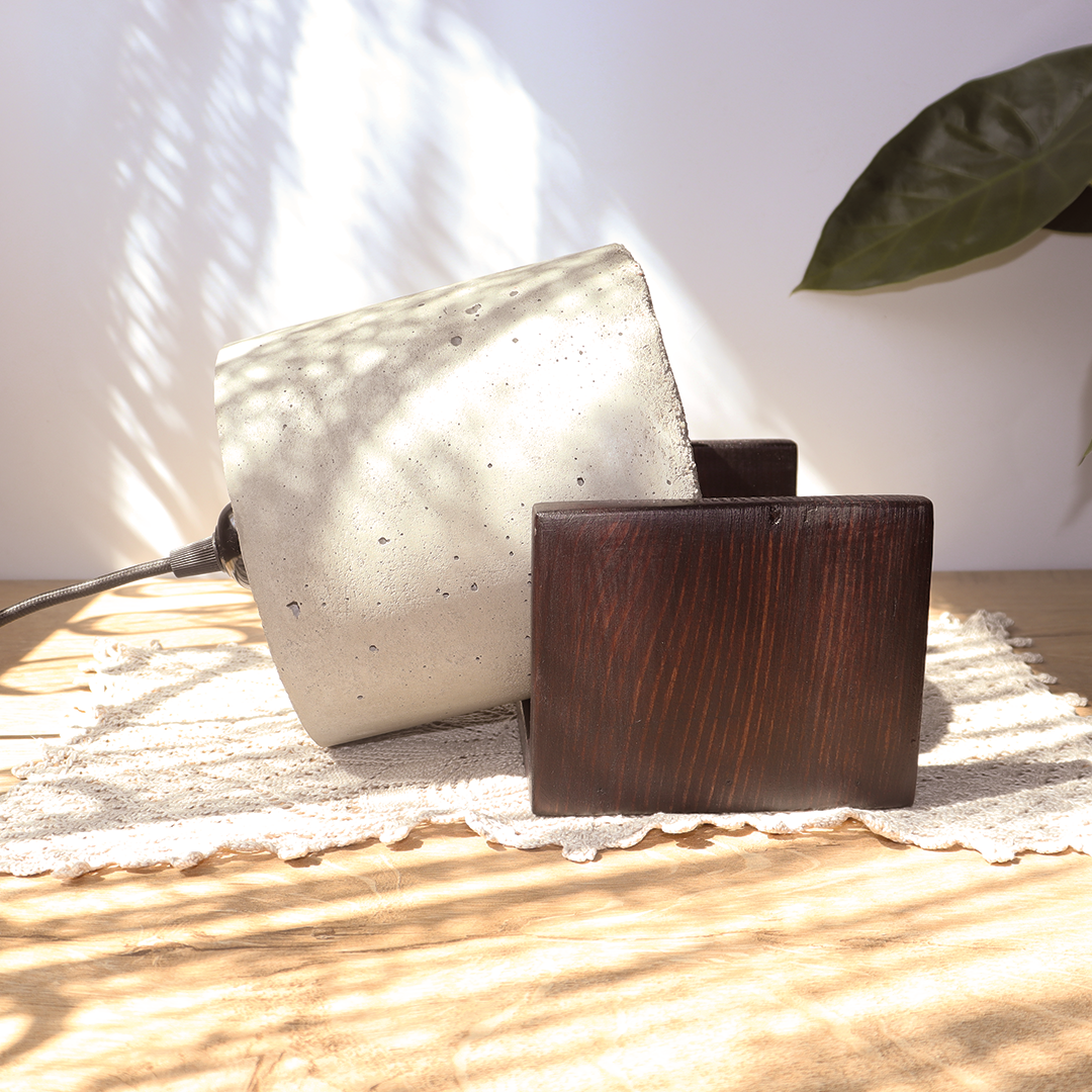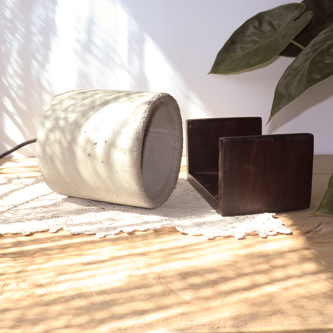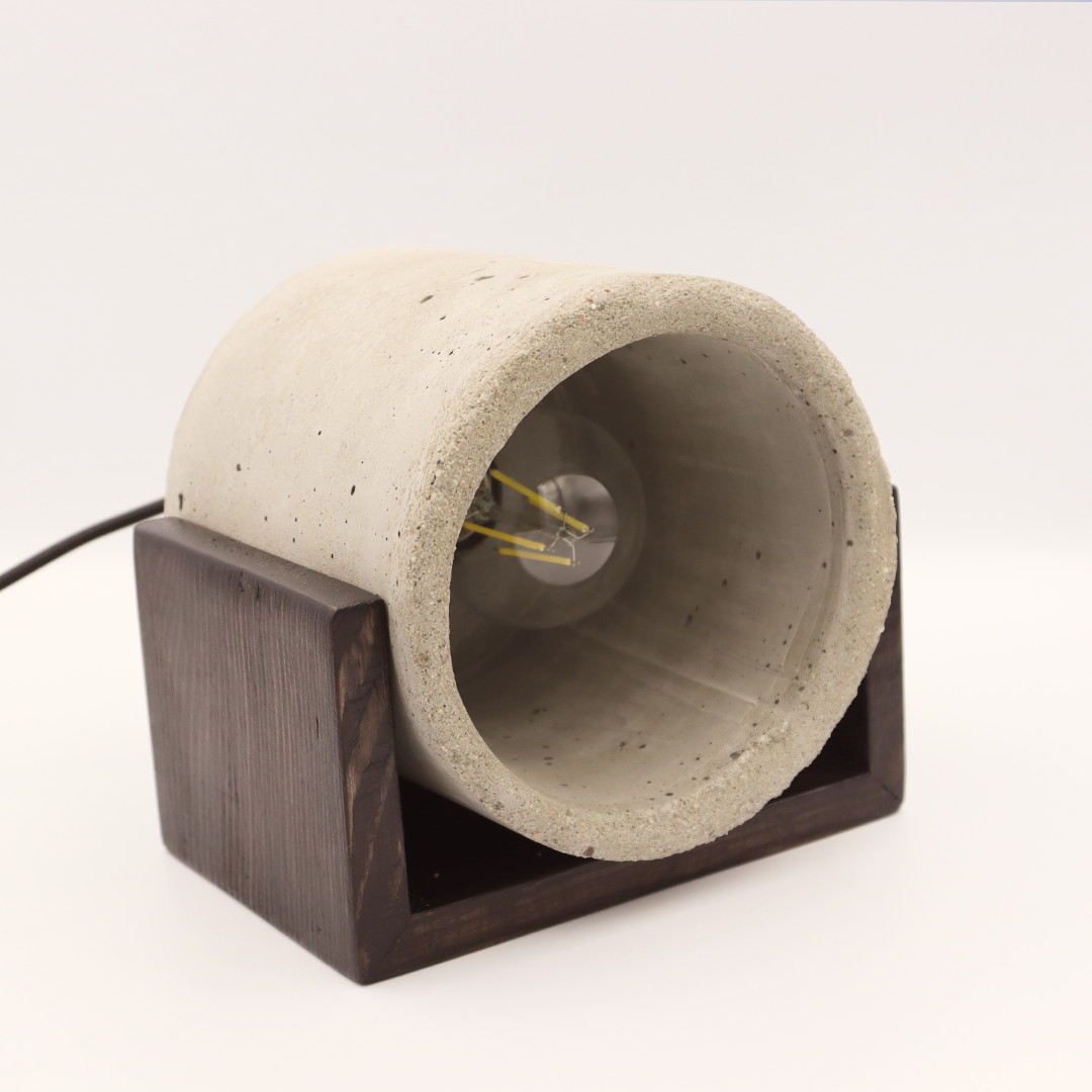 Cylindryczny kształt lampki, przypominający reflektor podkreśla jej oryginalny wygląd. Umieszczenie jej na podstawce z ciemnego drewna „zmiękcza” surowość betonu, jednocześnie potęgując jej oryginalny wygląd.