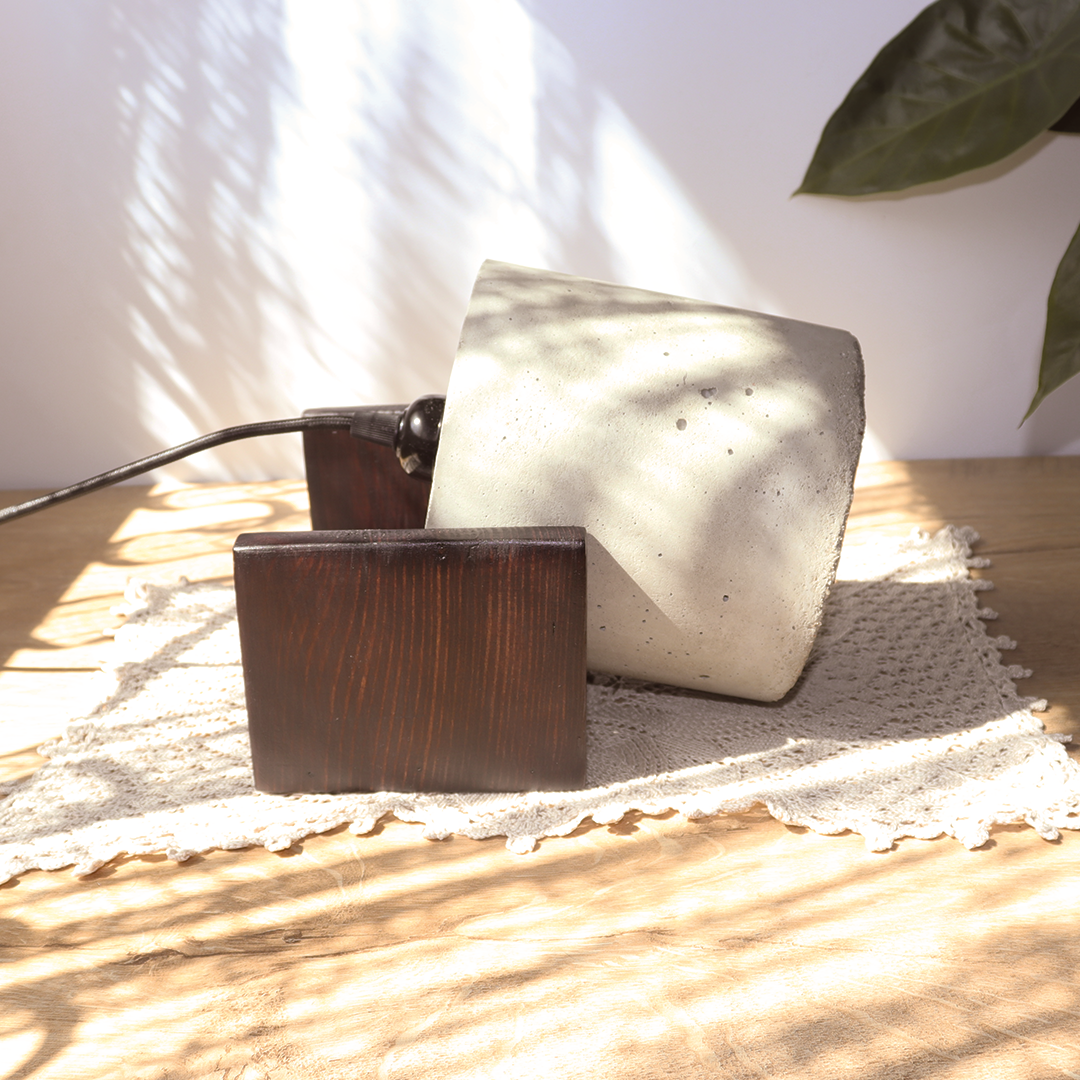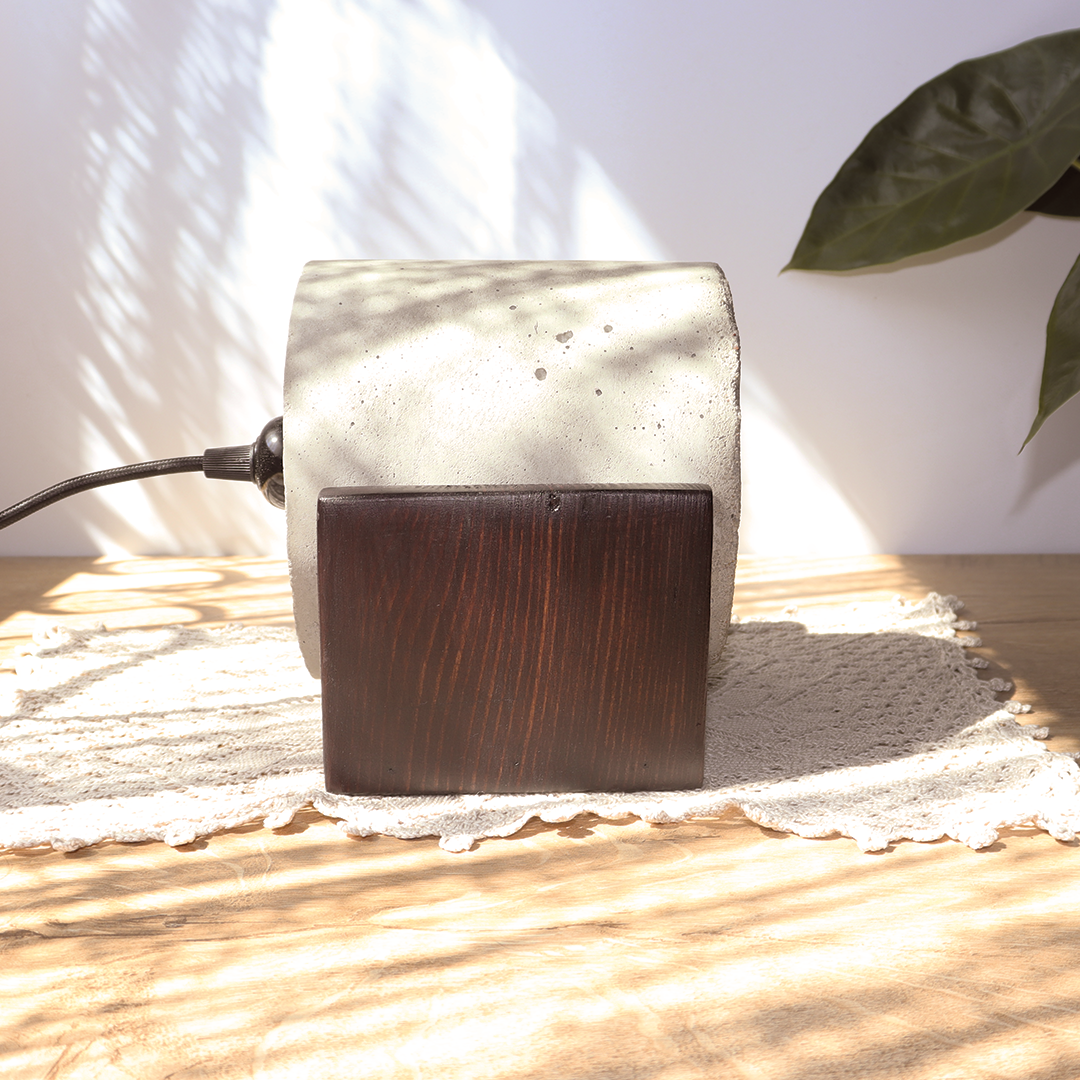 Lampka betonowa na drewnianej podstawce z kablem w oplocie