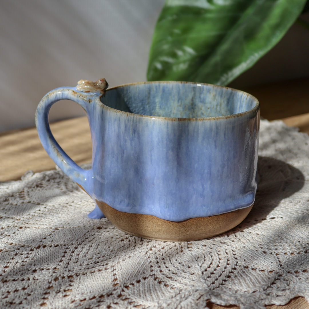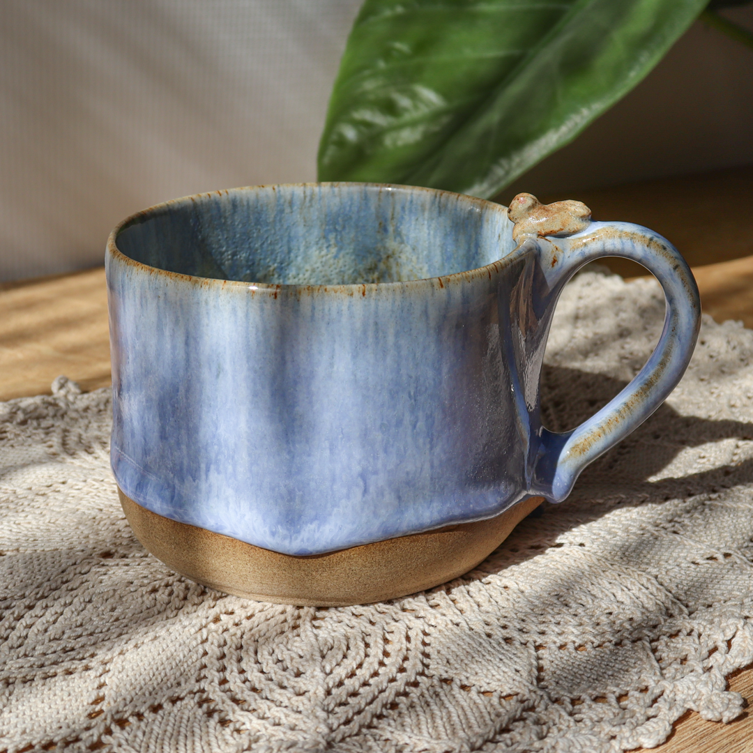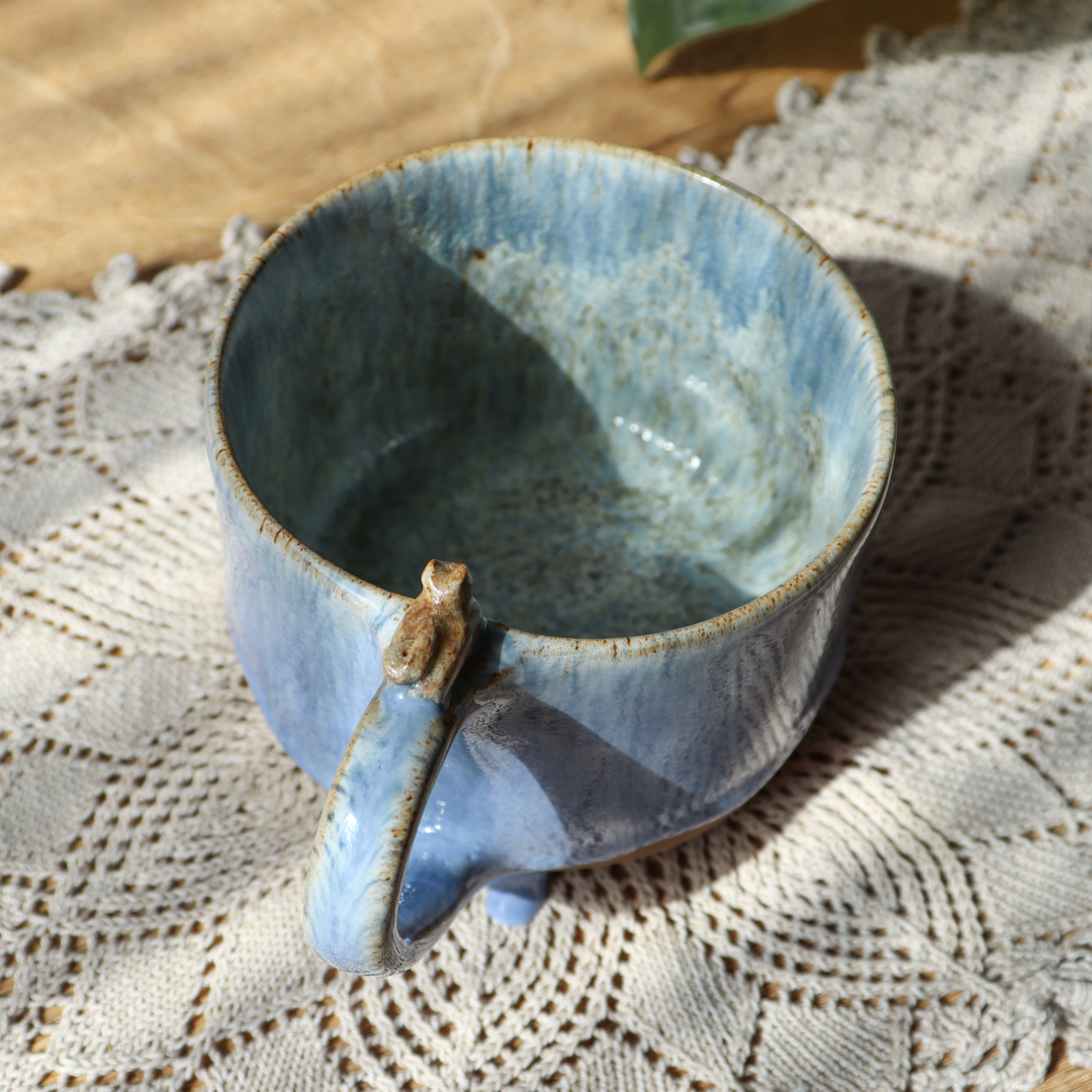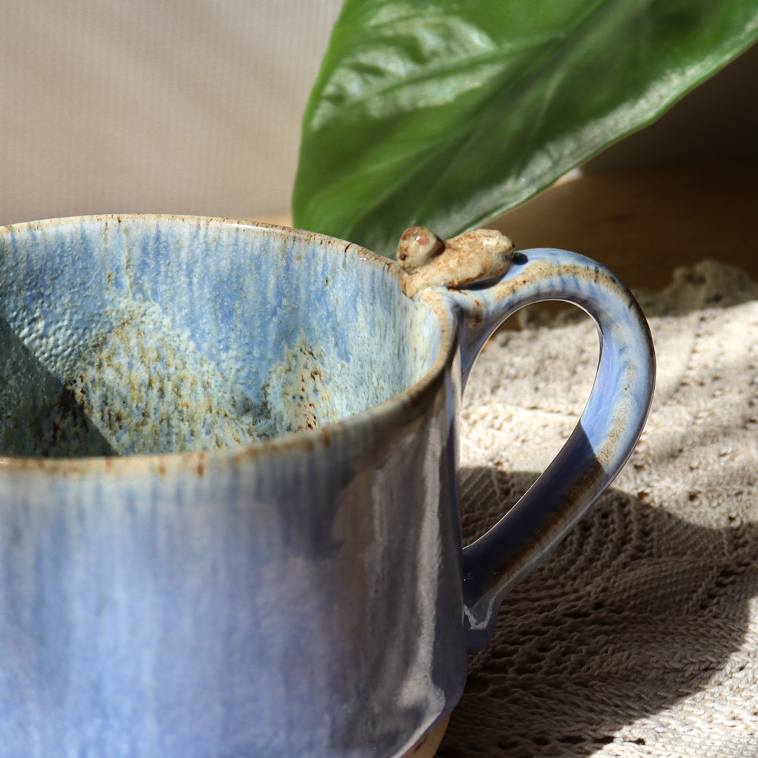 Dla prawdziwych wielbicieli oryginalnych kubków, mały kubek ceramiczny – Kotek o pojemności 300 ml. Ręcznie wykonany i ozdobiony uroczym kotkiem leżącym na uchu, pokryty w środku mieszanką  szkliwa z brązowymi i niebieskimi drobinami oraz na ściankach spływającym błękitnym szkliwem z ciemniejszymi drobinkami. Kubek ma duże ucho dzięki któremu idealnie leży w dłoni, a jego wymiary o średnicy 10 cm i wysokości 7 cm pozwala na komfortowe delektowanie się ulubionym napojem.