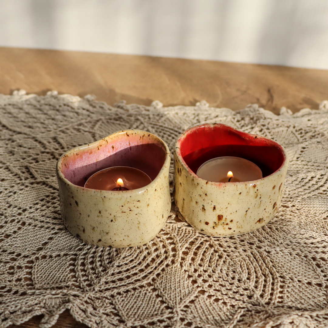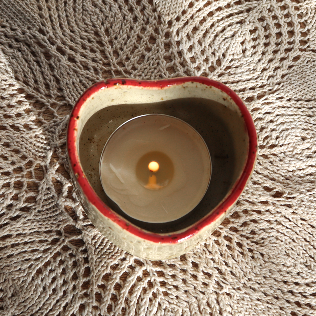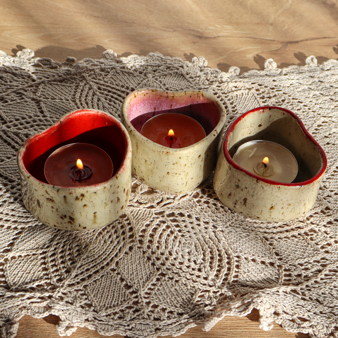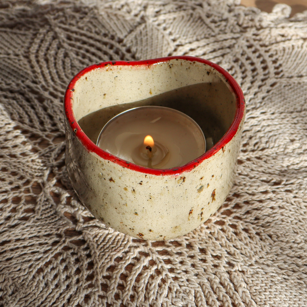 Ręcznie wykonany z beżowej gliny charakteryzującej się drobnymi piegami, świecznik ceramiczny – Serce, to wyjątkowy element dekoracyjny, który doskonale podkreśli urok wnętrza. Jest uformowany na kształt serca a jego wnętrze jest pokryte różowym, czerwonym lub bezbarwnym (z czerwoną obwódką na brzegu) szkliwem, podkreślającymi jego kształt. Został stworzony z myślą o standardowych wkładach t-light, ale jego wymiary o średnicy 6 cm wewnętrznej oraz 4 cm wysokości, pozwalają także na odłożenie zaparzacza do herbaty, dołączonego w zestawie.